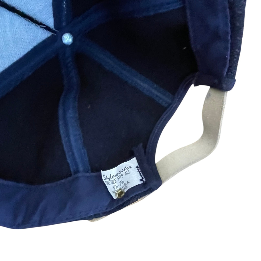 Size: OSFACondition: Faint wear on inside band Color: Navy/BrownBrand: Stylemaster Date: 1990sMaterial: Wool/Suede
