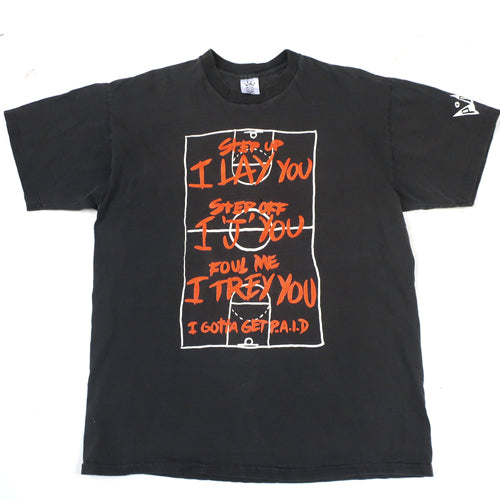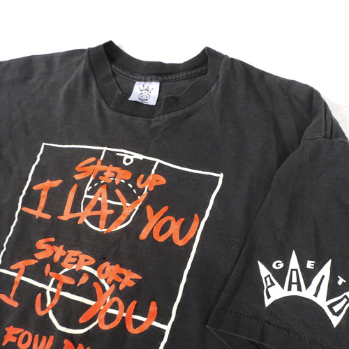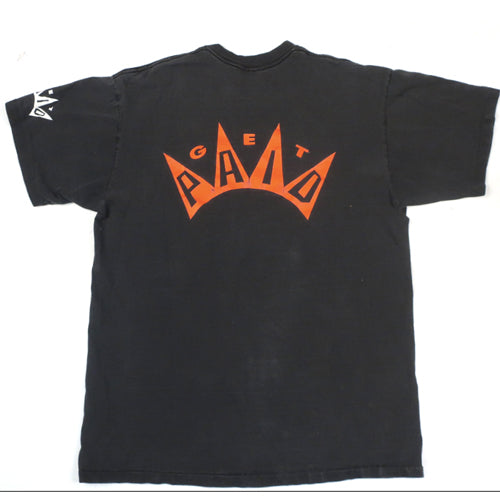 Size: XL but fits like a Large- 22" x 26" Condition: Faded w/a tiny hole on the frontColor: BlackBrand: Get PaidDate: 1990sMaterial: 100% Cotton